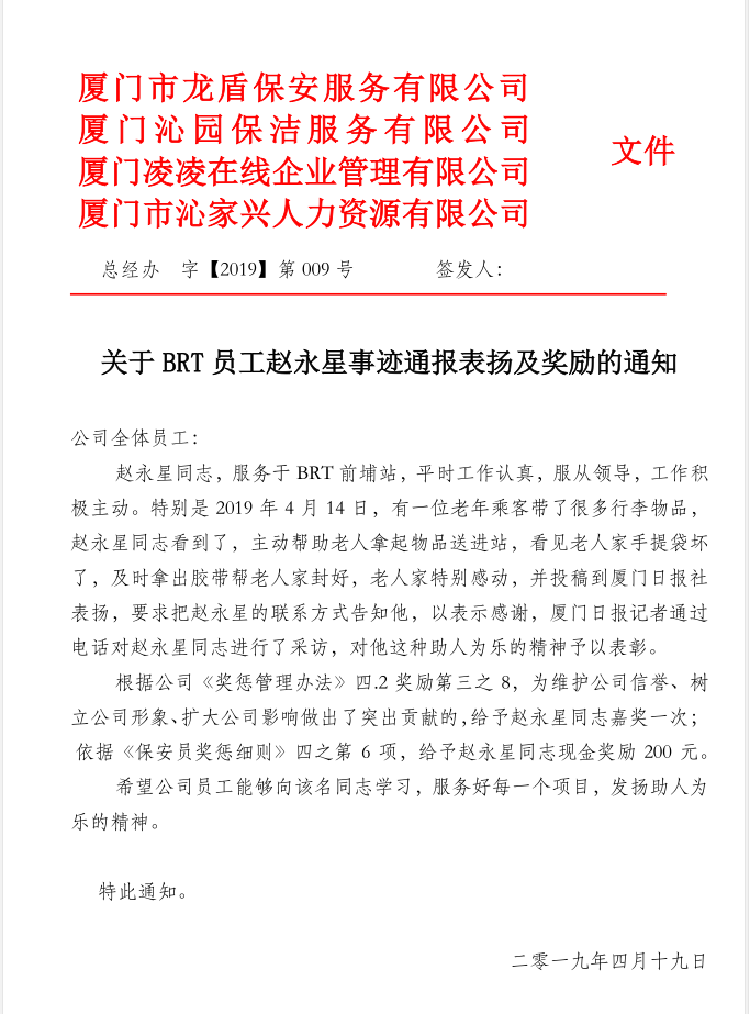 本報訊(記者 柯笛)過 BRT 安檢,行動不 便連續(xù)得到保安熱心幫忙,乘客內(nèi)心備感溫暖。 昨日,市民吳先生致電本報熱線 968820,真心感 謝這位保安師傅。 14 日下午 1 點(diǎn)多,吳先生來到 BRT 前埔樞 紐站準(zhǔn)備坐車,當(dāng)時手提兩個大袋子,外加一大 袋菠蘿,行動十分不便。過安檢的時候,一位高 高瘦瘦的保安主動上前幫忙,把吳先生攜帶的袋 子都搬上安檢履帶,結(jié)果剛過完安檢,裝菠蘿的 袋子突然破了個大口子,菠蘿掉了出來。 “還是那位保安,連忙跑過來幫我收拾,還找 來膠帶粘好了袋子。”吳先生非常感動,連忙道謝。 近日,記者通過輾轉(zhuǎn)聯(lián)系,找到了這位熱心 保安趙永星,并轉(zhuǎn)達(dá)了